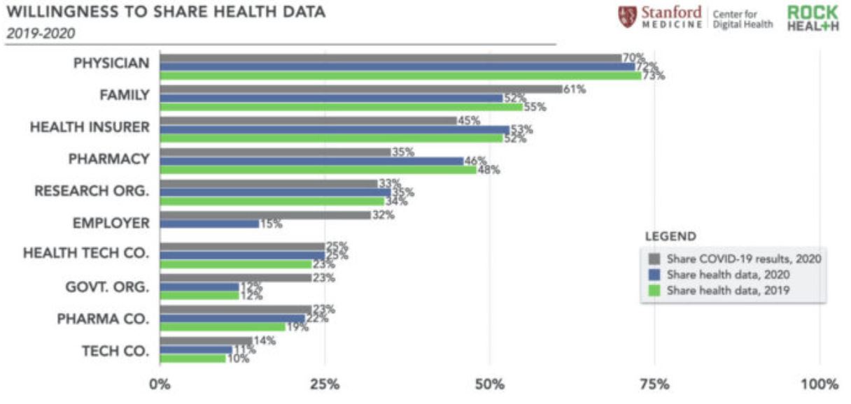 Как и в предыдущие годы, готовность потребителей обмениваться данными о своем здоровье зависит от того, с кем они обмениваются ими. Потребители по-прежнему наиболее охотно делятся данными о своем здоровье со своим врачом (72%), медицинской страховой компанией (53%) и семьей (52%).