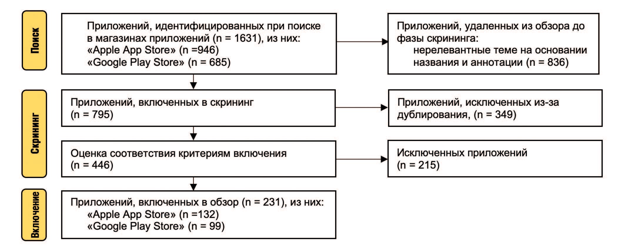Все идентифицированные приложения (n=1631) были включены в первоначальный список, позволяющий определить их общее количество и проанализировать релевантность названий и аннотаций теме исследования. На этом этапе были удалены 836 приложений как нерелевантные. Далее проведено выявление дубликатов и проверка соответствия приложений критериям включения. В результаты отбора в итоговую выборку вошло 231 уникальное мобильное приложение. Путем углубленного анализа выборки извлечены данные о числе скачиваний данного приложения, его рейтинге, условиях использования, функциональным возможностям и содержимом, включая отзывы пользователей. Это позволило выделить явные тематические группы среди приложений, систематизировать и описать их.