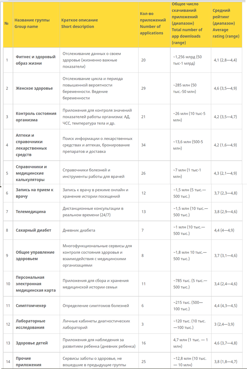 Таблица 1. Рейтинг тематических групп российских мобильных приложений, связанных со здоровьем и медициной