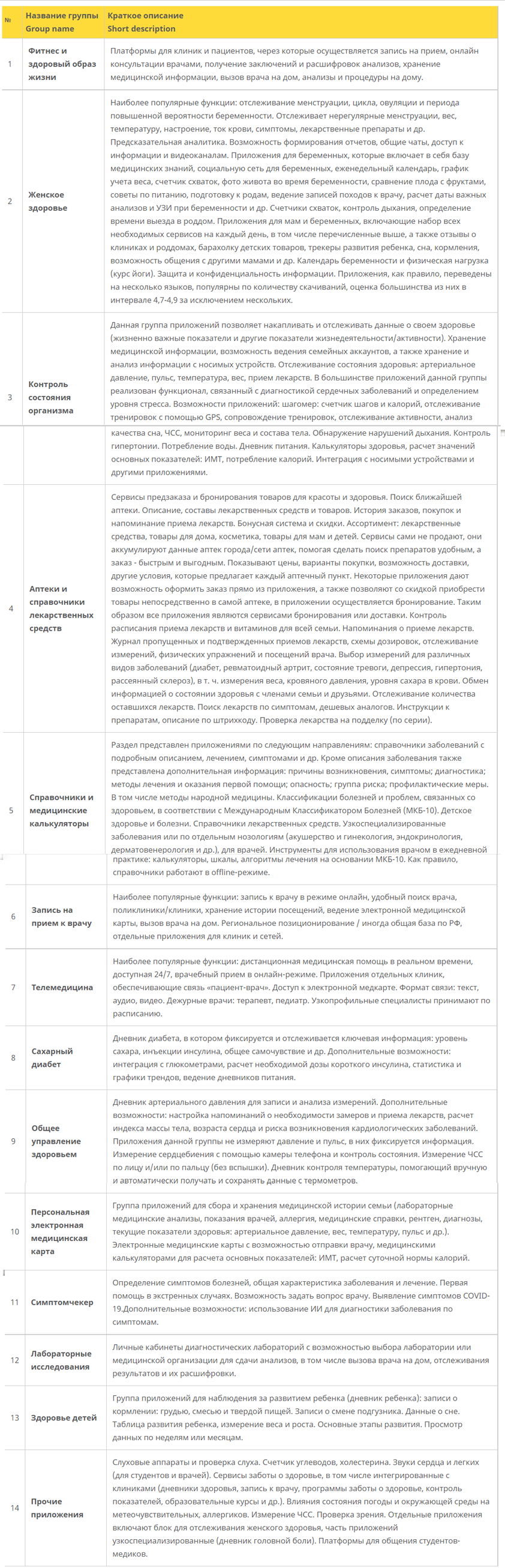 Таблица 2. Описание основных функциональных возможностей мобильных приложений, связанных со здоровьем и медициной