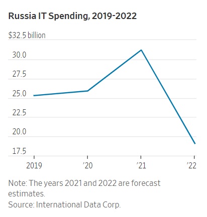 Санкции сократят расходы на ИТ в России в этом году примерно на 39%, или 12,1 млрд долл., до 19,1 млрд долл. по сравнению с прогнозными 31,2 млрд долл. в 2021 году, говорится в отчете International Data Corp, опубликованном The Wall Street Journal. Лидеры отечественного ИТ-рынка, с которыми пообщалось издание, полагают, что санкции приведут к серьезной нехватке аппаратного обеспечения и создадут трудности на фоне замены западного программного обеспечения альтернативами с открытым кодом или местными разработками.