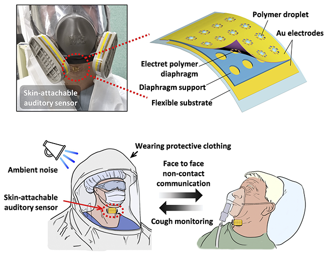 Ученые из Пхоханского университета науки и технологии в Южной Корее разработали сенсор, который позволяет людям в масках, например, врачам, легче общаться. Устройство представляет собой носимый микрофон, который улавливает колебания кожи на шее, возникающие при разговоре. Исследователи надеются, что это устройство может быть полезным для врачей, вынужденных носить маски для защиты от патогенов, таких как COVID-19, но которым также необходимо четко общаться друг с другом.