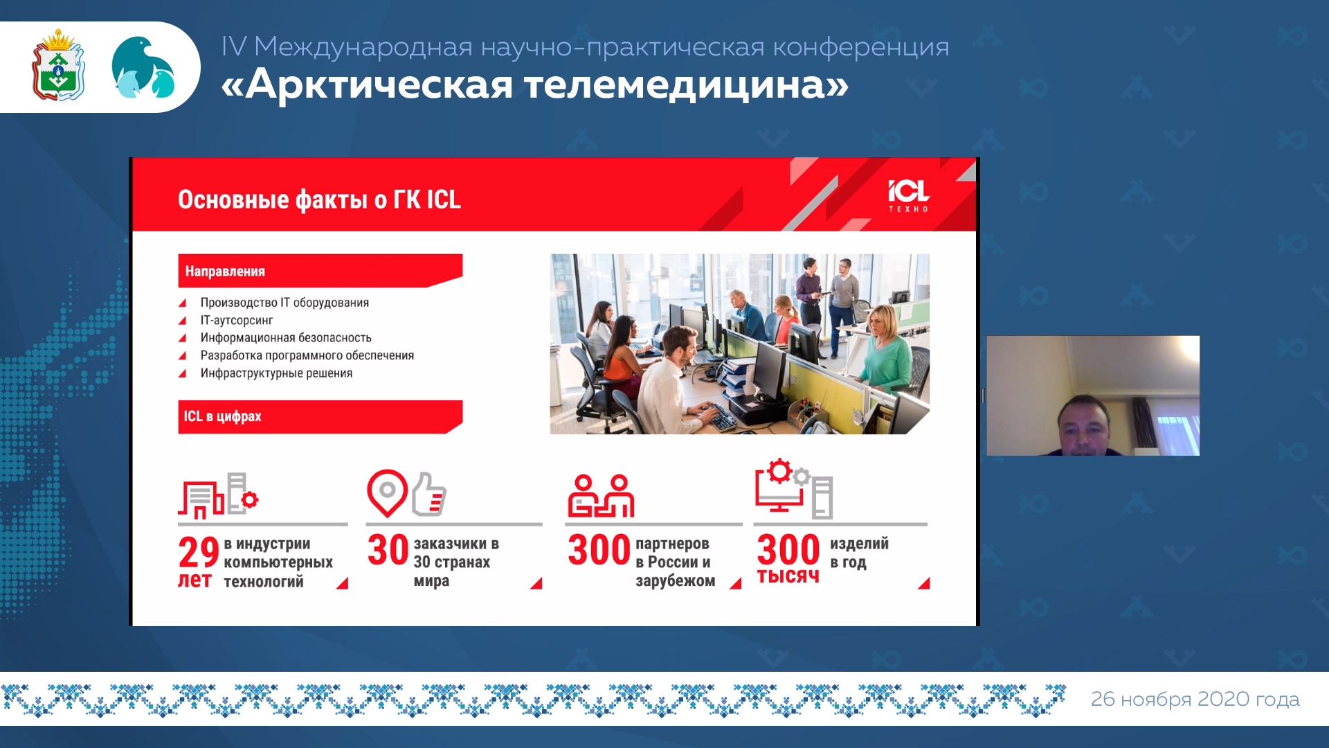 26 ноября 2020 года в онлайн формате состоялась IV Международная научно-практическая конференция «Арктическая телемедицина». Целью конференции было обсуждение вопросов использования информационных технологий для обеспечения доступности и качества медицинской помощи в условиях Крайнего Севера (Арктической зоны).