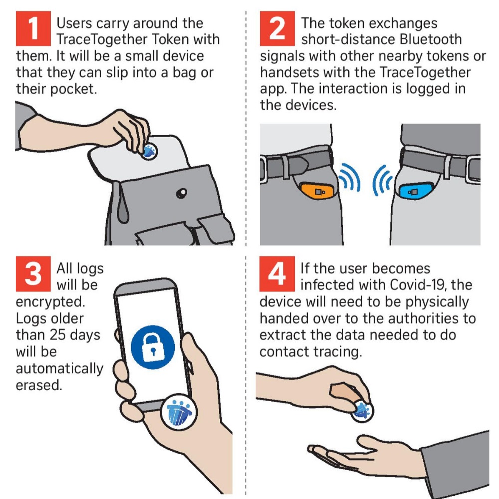Департамент цифрового правительства (The Smart Nation and Digital Government Office) при Канцелярии премьер-министра Сингапура объявил о том, что правительство Сингапура начало общенациональное распространение жетонов (токенов) TraceTogether, предназначенных для отслеживания контактов в условиях пандемии, среди широкой общественности. Предполагается, что их распространение будет завершено к ноябрю текущего года.