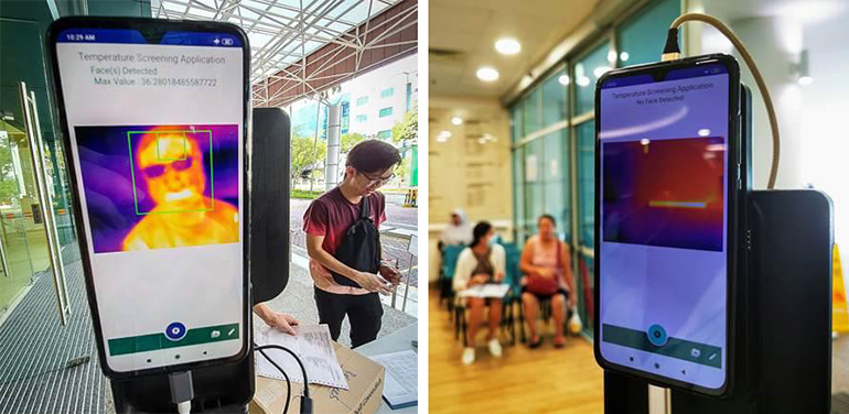 Сингапурская фирма IHIS и компания KroniKare разработали и в настоящее время тестируют новую систему диагностики повышенной температуры (лихорадки), которая использует тепловизионные и лазерные камеры в сочетании со смартфоном для измерения температуры людей на расстоянии. Эта технология может помочь ускорить прохождение людей через транзитные узлы, больничные подъезды и другие места скопления людей, в то же время избавляя от необходимости использовать большое количество приборов для ручного измерения температуры каждого человека.