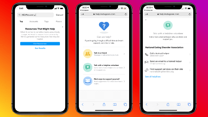 Инстаграм заявила, что она будет размещать программы NEDA в разделе Reels, проводить внутренние сессии обратной связи со специалистами в этой сфере, чтобы опередить возникающие вопросы, а в ближайшие недели предоставит пользователям возможность напрямую обмениваться сообщениями с друзьями из ресурсов поддержки.