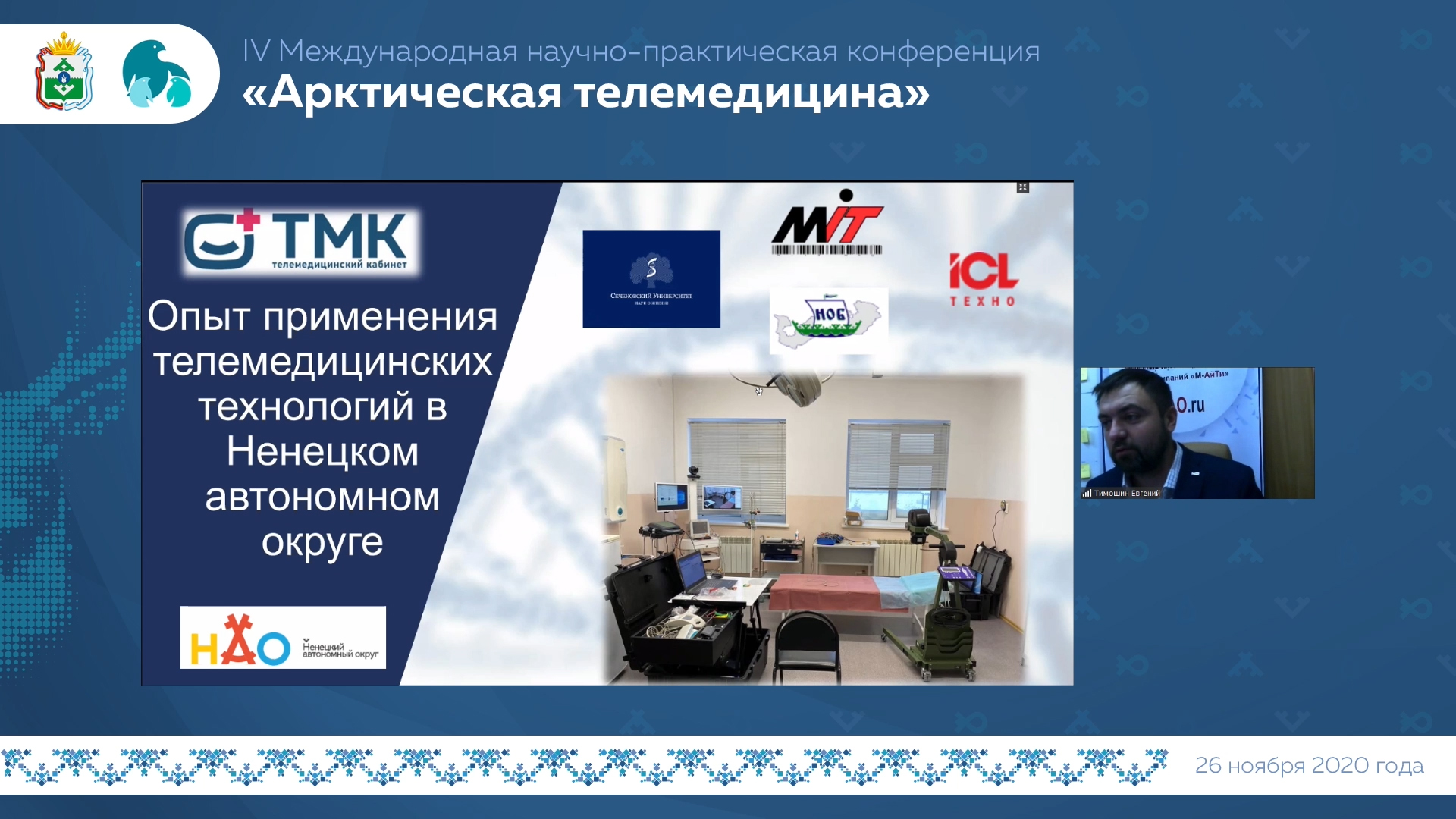26 ноября 2020 года в онлайн формате состоялась IV Международная научно-практическая конференция «Арктическая телемедицина». Целью конференции было обсуждение вопросов использования информационных технологий для обеспечения доступности и качества медицинской помощи в условиях Крайнего Севера (Арктической зоны).