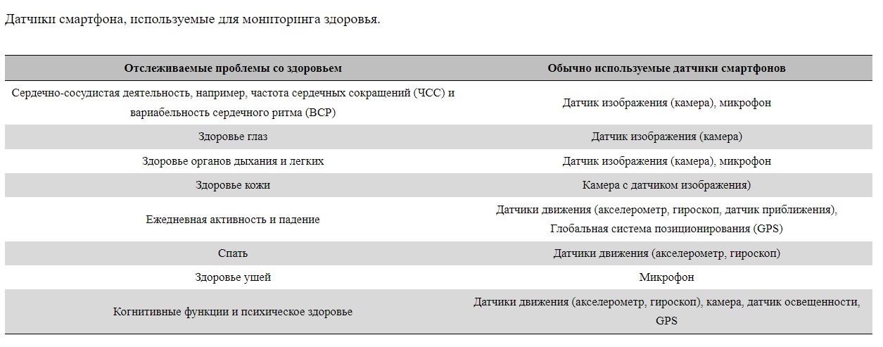 Современные смартфоны оснащены целым рядом встроенных датчиков, таких как дополнительный датчик изображения металл-оксид-полупроводник (CMOS) с высоким разрешением, датчик глобальной системы позиционирования (GPS), акселерометр, гироскоп, магнитометр, датчик внешней освещенности и микрофон. Их можно использовать для измерения нескольких параметров здоровья, таких как частота сердечных сокращений (ЧСС), вариабельность сердечного ритма (ВСР), частота дыхания (ЧД), а также для выявления некоторых заболеваний.