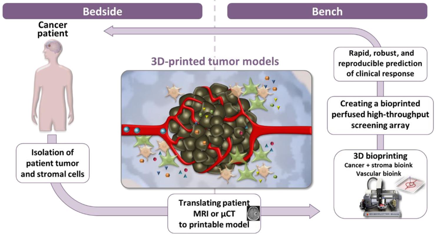 Если мы возьмем образец ткани пациента вместе с его внеклеточным матриксом, мы можем с помощью 3D-биопринтера напечатать из этого образца 100 крошечных опухолей и протестировать множество различных препаратов в различных комбинациях, чтобы найти оптимальное лечение для этой конкретной опухоли. Или мы можем протестировать множество соединений на такой модели опухоли и решить, какое из них наиболее перспективно для дальнейшей разработки и инвестиций в качестве потенциального лекарства.