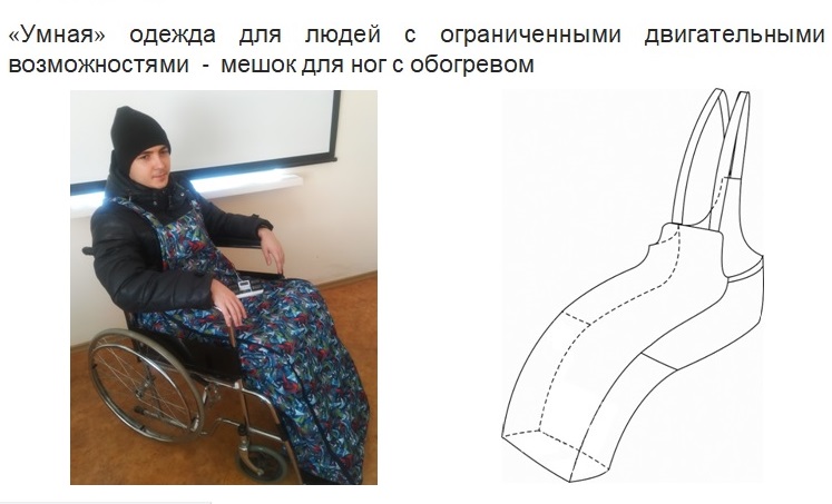В 2016 году я поступила в аспирантуру и тогда я уже чётко имела представление, что буду разрабатывать «умную» одежду для людей с инвалидностью. Под руководством доцента Савельевой Н.Ю. разработано теплозащитное изделие по типу «мешка для ног» с дополнительной системой обогрева, управление которой осуществляется при помощи приложения на смартфоне. Выбор данной ассортиментной линейки обоснован тем, что в настоящее время для ЛОДВ практически отсутствует специальная одежда для холодного времени года. В нашем изделии человек с ОДВ может находиться до 2 часов при минус 15°С, не испытывая дискомфорта.
