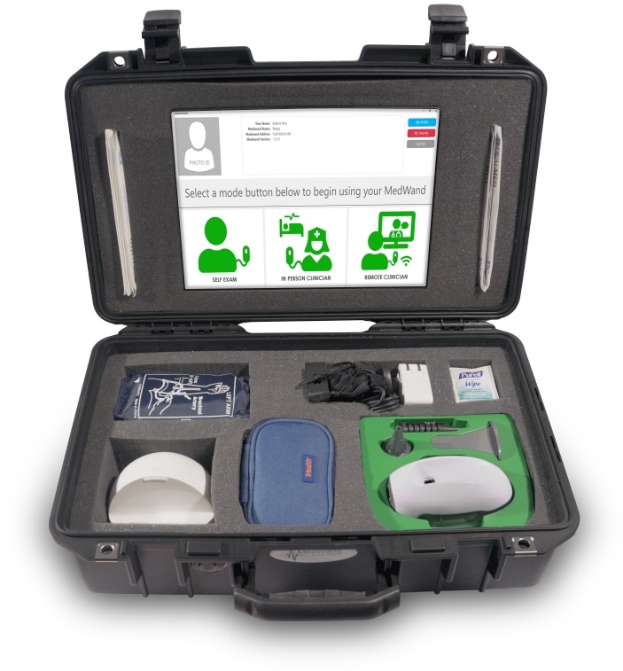 MedWand имеет телемедицинские приложения для использования в военных условиях, в домашнем здравоохранении, обычных клиниках, хосписе и паллиативной медицине. Базовый комплект MedWand включает в себя собственно прибор MedWand, стартовый набор аксессуаров и противомикробный чехол для хранения. После бесплатной загрузки программного обеспечения MedWand он может использоваться с существующим совместимым планшетом, ноутбуком или компьютером с ОС Windows 10. Эта полностью готовая к использованию система обеспечивает безопасную и надежную связь с врачом или поставщиком услуг телемедицины.