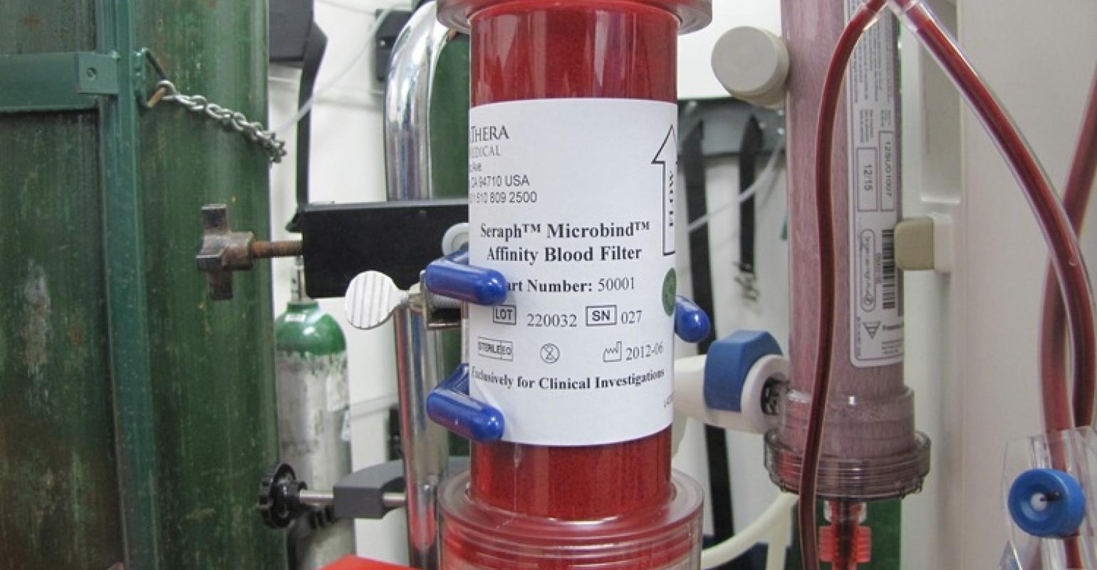 Seraph 100 Microbind Affinity Blood Filter - это первое устройство для очистки крови, которое, по словам компании ExThera, снижает как бактериальную, так и вирусную нагрузку в кровотоке. Принцип работы Seraph 100 основан на том, что когда кровь пациента проходит через фильтр, она взаимодействует с крошечными шариками с рецепторами, имитирующие рецепторы на клетках человека, которые являются мишенью для патогенов, когда они вторгаются в тело. Вирусы быстро захватываются и адсорбируются на поверхности шариков и тем самым удаляются из кровотока. Seraph 100 ничего не добавляет в кровь, которая возвращается пациенту неповрежденной с кровяными клетками и белками. Устройство фильтрует только патогенные микроорганизмы, вызывающие инфекцию, а также связывает и удаляет вредные вещества, вырабатываемые такими микроорганизмами и возникающие при реакции организма на инфекцию.
