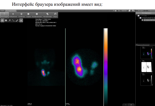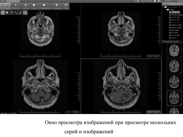 Непосредственно с консоли диагностических аппаратов можно передавать данные о запланированных исследованиях и транслитировать их. При просмотре изображений поддерживаются возможности перемещения и изменения масштаба изображений, настройка яркости и контраста изображения. При необходимости можно устанавливать стандартные для КТ «оптические окна», измерять линейные и угловые величины, а также площади и плотности по шкале Хаунсфилда (HU). Просмотр изображений поддерживается возможностью их поворота на любой угол и зеркальное отображение по горизонтали и вертикали. В числе других необходимых инструментов имеется инверсия изображения, изменения палитры. Врач может просматривать с удобной для него скоростью DICOM файлы, содержащие кино петли, видео в формате MPEG-2, файлы, содержащие инкапсулированный PDF-объект, а также распечатывать изображения, записывать результаты исследований на лазерные носители или сохранять их на жесткий диск и flash-накопители.