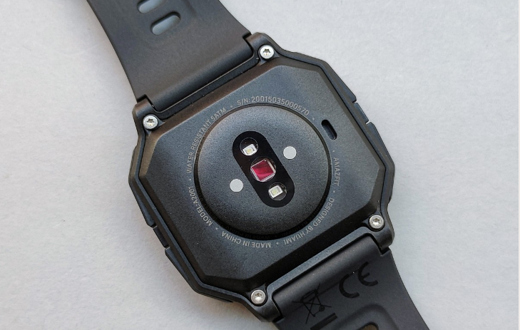 - Осмотрев заднюю часть Amazfit Neo, мы видим два разъема. Один предназначен для зарядки, второй – оптический датчик сердечного ритма PPG Bio-Tracking. Он расположен внутри возвышающейся круглой пластины, обеспечивающей надлежащий контакт фиксатора с кожей, чтобы проводить точные измерения и не допускать на поверхности появления грязи.