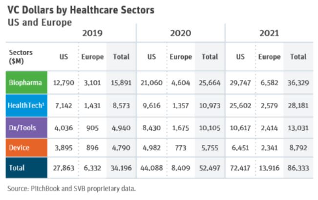 По прогнозам Silicon Valley Bank, в 2022 году объем венчурных инвестиций в здравоохранение в компаниях ЕС и США составит около €56,5 млрд, поскольку венчурные инвесторы замедлят темпы заключения сделок, но продолжат инвестировать из недавно закрытых фондов.