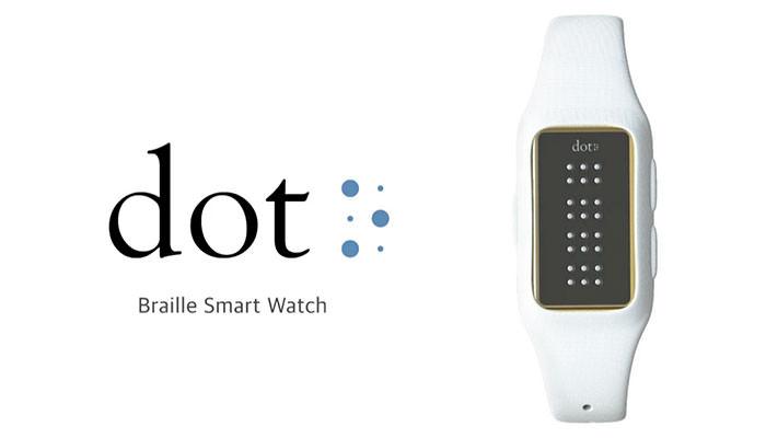 Часы Dot — первые в мире умные часы со шрифтом Брайля. Они помогают слепым получать доступ к сообщениям, твитам и даже книгам в любом месте и в любое время. Dot могут подключаться через Bluetooth к любому смартфону, а затем извлекать и переводить текст (из приложения электронной почты или обмена сообщениями) на шрифт Брайля для своего владельца.