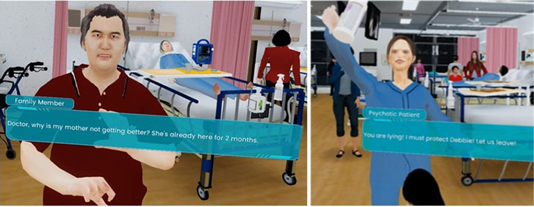 Специалисты Национального университета Сингапура разработали систему обучения в виртуальной реальности (virtual reality, VR), которая позволяет медицинскому персоналу научиться справляться с возбужденными или агрессивными пациентами. Пациенты, особенно с психическими расстройствами, могут быть раздражены и расстроены, и научиться обращаться с такими пациентами с сочувствием и эффективно, очень важно для медицинского персонала. Эта новая система призвана имитировать обычные ситуации для обучающихся медсестер и врачей и позволяет им совершать ошибки, не причиняя вреда и не создавая риска. Система довольно сложна и имитирует обычные отвлекающие факторы, встречающиеся в загруженных медицинских отделениях, чтобы сделать опыт как можно более реалистичным.