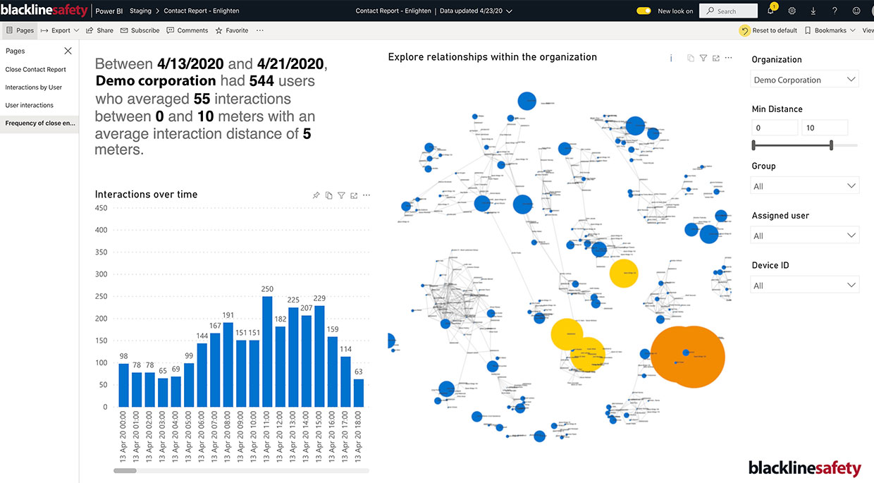 Теперь решение компании Blackline адаптировано к COVID-19, позволяя системам слежения за местоположением генерировать отчеты о тесном контакте. Наборы данных показывают, какие работники часто находятся рядом с другими работниками, и где на рабочем месте это происходит. Если сотрудник заражается коронавирусом, компания может использовать эту систему для просмотра истории местонахождения сотрудника на месте, чтобы выяснить, какие сотрудники могли быть подвержены воздействию коронавируса.