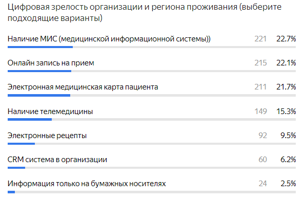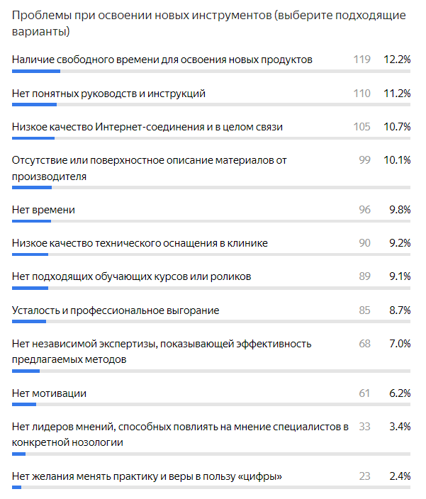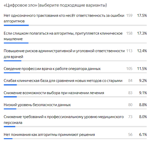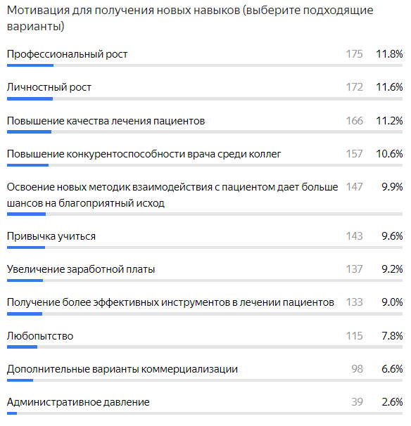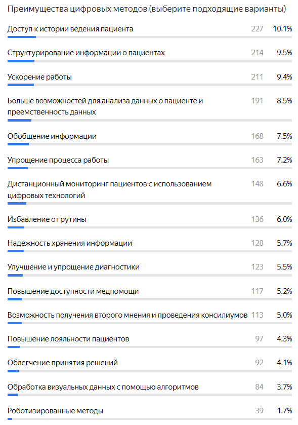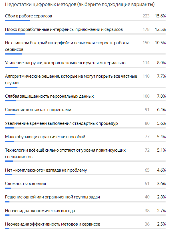 Опрос проведен не анонимно, то есть отвечавшие на вопросы специалисты оставляют свои координаты и с ними при желании можно обсудить те или иные ответы, возможно технологическим игрокам будет интересно провести фокус-группы с частью профессионального сообщества. Но и сами по себе результаты опроса очень информативны. Мы давали врачам готовый набор ответов, с возможностью промаркировать подходящие ответы, которые были отобраны в результате предыдущих опросов и работы с медицинскими специалистами. Фактически на выходе мы получили рейтинг наиболее распространенных ответов.