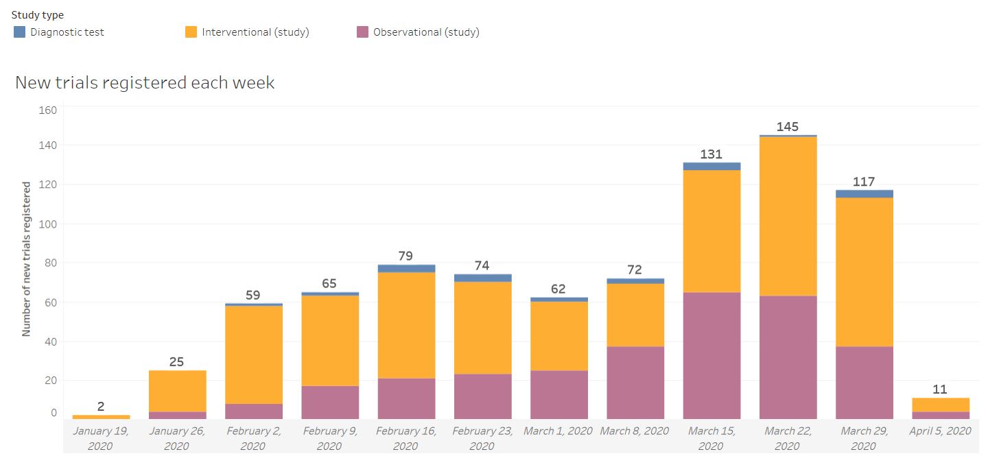 - За последние 4 месяца было запущено или подготовлено к проведению почти 1000 исследований COVID-19. Это равнозначно в среднем 210 исследованиям в месяц по сравнению всего лишь с 40 исследованиями рака молочной железы в месяц и 1 исследованием малярии в месяц.