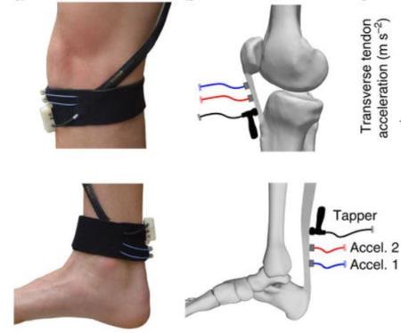 Этот миниатюрный прибор устанавливается на коже ноги поверх сухожилия, и работает, слегка нажимая на него с частотой 50 нажатий в секунду. Каждое такое нажатие инициирует волну в сухожилии, а два миниатюрных акселерометра определяют, как быстро эта волна двигается. Это позволяет оценить силу путем измерения вибрационных характеристик изменений сухожилия под нагрузкой. При этом измеряется и растягивающее усилие.