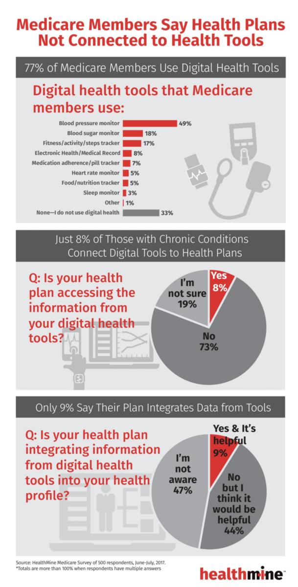 Более ранний опрос, проведенный компанией HealthMine, 750 граждан США в возрасте 64 года и младше, которые пользуются страховкой, спонсируемой работодателем, показал, что 83% из них используют цифровые устройства, но только 22% сообщили, что данные таких устройств применяются в рамках этого страхового плана для выдачи рекомендаций пациентам.