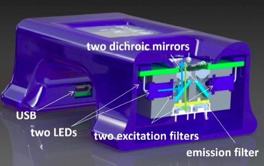 Новый прибор представляет собой автономный блок, который может одновременно осуществлять 4 реакции с помощью виртуальных реакторных камер, в которых образец объемом примерно в 200 нл покрывается минеральным маслом и помещается под стекло.