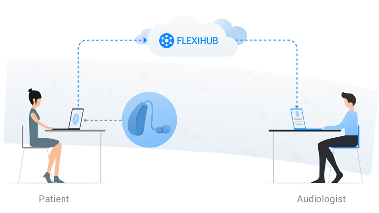 Специалист по настройке слуховых аппаратов или врач-отоларинголог одним кликом подключается через FlexiHub к слуховому аппарату и получает полный доступ к настройкам, также, как если бы он физически подключен к настраивающему устройству. Затем он настраивает слуховой аппарат пользуясь своим профессиональным программным обеспечением. Кроме этого, посредством аудио- и видео-чата медицинский специалист может консультировать пациента без необходимости поддерживать с ним физический контакт.