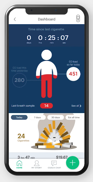 Мобильный сенсор дыхания Pivot, уже получивший сертификацию американских регулирующих медицинскую отрасль органов, измеряет содержание монооксида углерода в дыхании (CO является одним из основных токсинов сигаретного дыма.)
