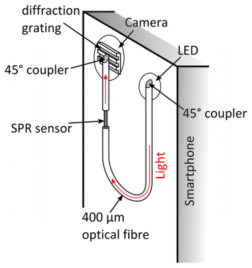 Сенсоры смартфона основаны на использовании дискретных линз или дифракционных решеток для возбуждения поверхностных плазмоновых волн на стыке сред золото-полимер или золото-стекло. Датчик производится путем использования простого метода серебряного покрытия и полировки обеих концов оптического волокна размером в 400 мкм для получения поверхностей под углом в 45°. В работе системы используется вспышка и камера смартфона, никакие дополнительные электронные компоненты не используются.