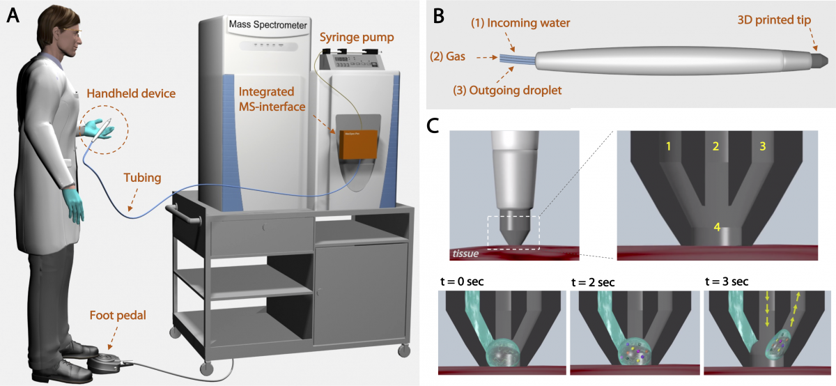 Новая система получила название MasSpec Pen. Это одноразовое ручное устройство, которое помещает каплю воды на поверхность ткани, откуда берутся биомолекулярные пробы. Затем капля аккуратно всасывается устройством и отправляется в масс-спектрометр, который формирует молекулярный профиль на основе белков, липидов и метаболитов в образце.