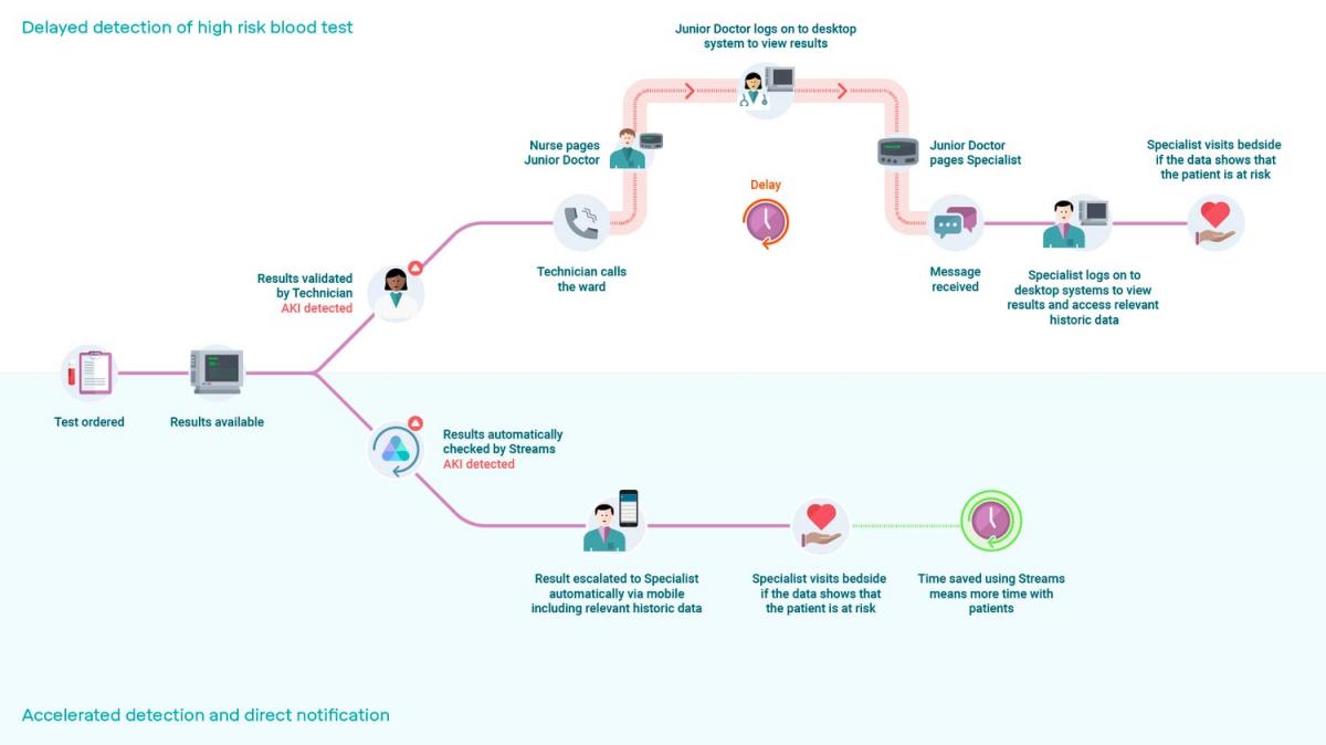 Врачи Royal Free London тесно сотрудничали с экспертами DeepMind Health, которые разработали Streams, с целью улучшения результатов лечения пациентов путем предоставления необходимых данных нужному врачу в нужное время. Подобно экстренному оповещению с помощью мобильного телефона, технология немедленно уведомляет медсестер и врачей, когда результаты анализов показывают, что пациент рискует серьезно заболеть острой почечной недостаточностью, и предоставляет информацию, необходимую для принятия необходимых мер.