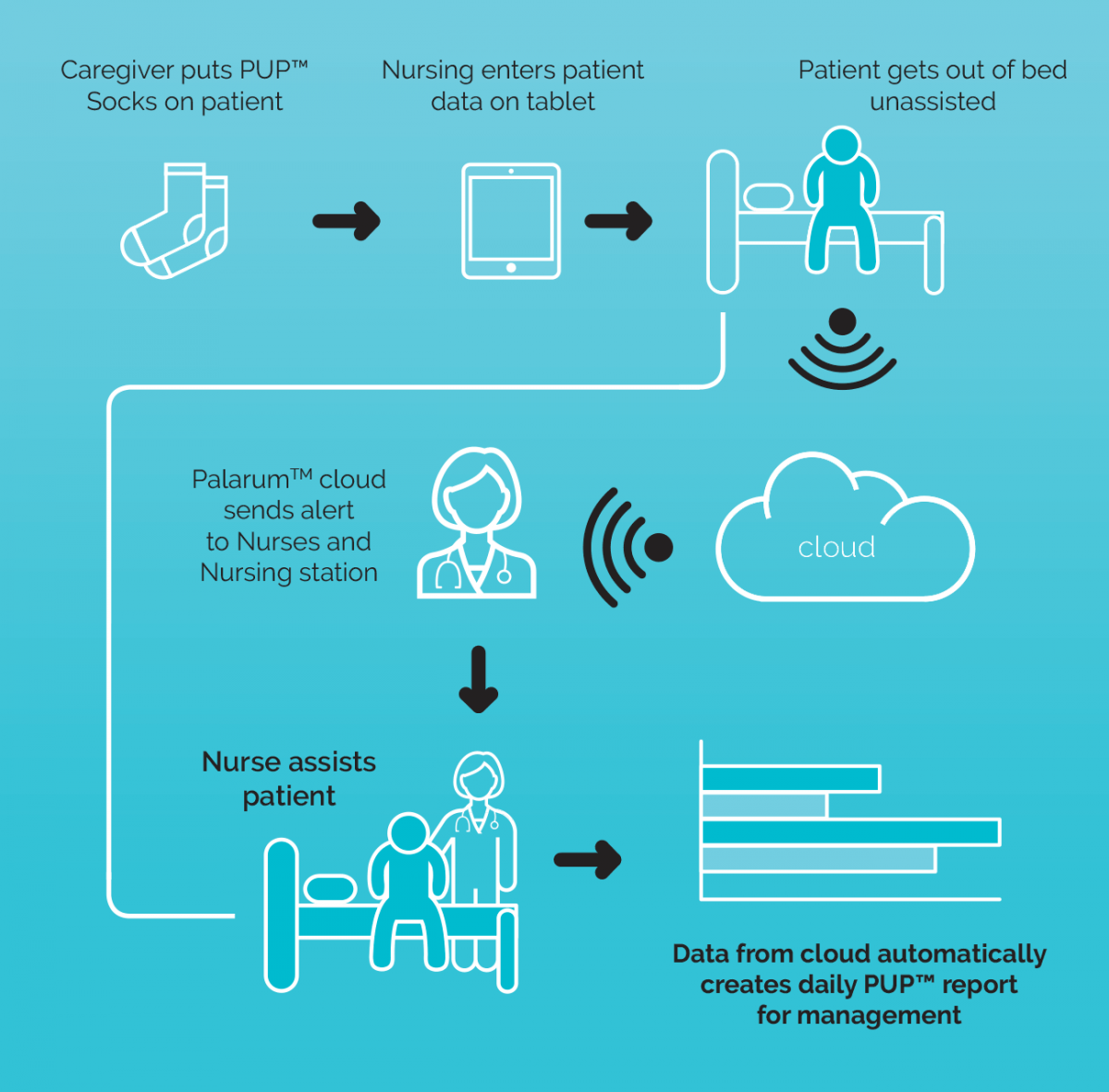 Американская компания Palarum разработала инновационную систему предотвращения падений для пожилых людей, которая основана на использовании "умных" носков. Эти носки со встроенными непосредственно в ткань сенсорами в реальном времени обеспечивают мониторинг пациентов с целью предотвращения их падений и расширения возможностей терапии и реабилитации. Используя беспроводную связь, эта система немедленно отсылает тревожный сигнал на сестринский пост, если пациент встал с постели, идет без сопровождения и подвергается риску падения. Носки изготовлены из специальной проводящей ткани eTextile, состоящей из нейлона с вплетенными в него нитями из эластомеров с металлическими частицами. И когда пациент становится на ноги и находится без присмотра, встроенные в носок датчики сообщают об этом медсестре через специализированные "умные" часы или планшет. Носки выдерживают до 80 циклов стирки.