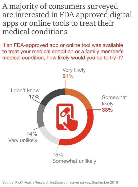 Согласно новому отчету компании PricewaterhouseCoopers, составленному на основе данных опроса и другой информации о тенденциях в области здравоохранения за последний год, 54% потребителей готовы использовать программное обеспечение или цифровое устройство, имеющее разрешение на использование от регуляторов медицинской отрасли, для лечения какого-либо заболевания.