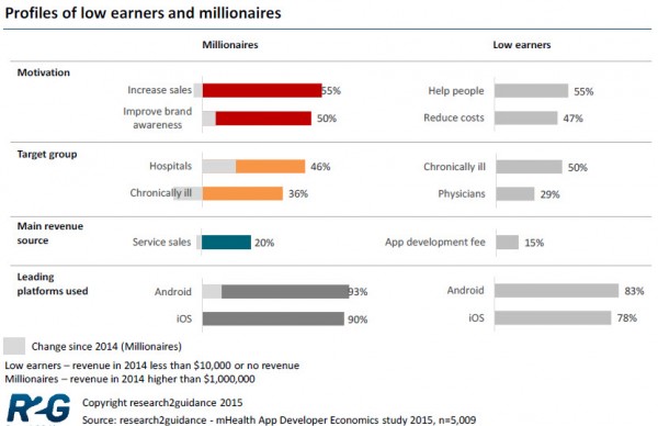 Примерно 47% успешных разработчиков ("миллионеров") находятся в этом бизнесе с 2010 года и свой доход они получают с помощью медицинских услуг, которые пользователи получают с помощь их приложений. Основная цель таких компаний - увеличение продаж существующих сервисов и продуктов. Они также больше предпочитают разрабатывать приложения для больниц, чем программные продукты для хронически больных. Кроме того, "миллионеры" стремятся иметь больший портфель приложений - в среднем 12 против 7 у других разработчиков.