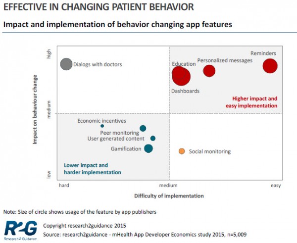 Исследователи также изучали, как приложения влияют на изменение поведения пользователей и отметили, что программы, которые действуют как системы напоминания, легче всего внедряются и более эффективны. И хотя приложения, которые обеспечивают прямое взаимодействие пациента с врачом, например, еженедельная отсылка врачу результатов анализов и получение от него обратной связи, больше всего влияют на изменение поведения пациентов, такие приложения труднее всего внедряются.