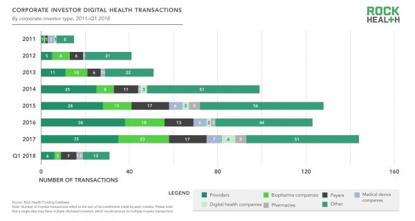 Крупнейшей группой в секторе корпоративных инвестиций являются провайдеры (больницы, медицинские системы, врачебные практики), на долю которых пришлось 24% инвестиций. За ними следуют фармацевтические компании с долей в 13% и страховые компании (12%). Такие крупные компании, как Amazon, GE и Apple, хотя и создают много шума на этом рынке, на самом деле вносят очень малую долю в общий котел инвестиций в сфере цифровой медицины.