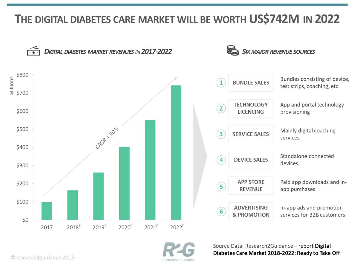 Рынок цифровой медицины в сфере лечения диабета быстро растет и в 2017 году утроился, достигнув $98 млн, отмечается в исследовательском отчете компании Research2Guidance. Сейчас этот рынок небольшой, но его ожидает значительный и стремительный рост благодаря дополнительному доходу из-за комплексных продаж устройств и систем цифрового контроля диабета, а также дополнительных источников. В итоге к 2022 году объем всего рынка достигнет $742 млн. Компании этого рынка определились с бизнес-моделью, которая, судя по всему, работает, и это отразится на будущих продажах.