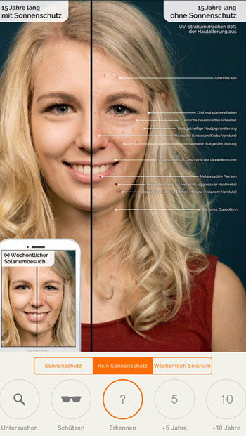 Это приложение позволяет пользователю сделать селфи и затем предлагает выбор из трех категорий - "дневная защита от солнца", "без солнцезащиты" и "еженедельное времяпровождение на шезлонге". После этого программа предлагает пользователю взглянуть на свое лицо, каким оно будет через 5 - 25 лет. Все эффекты, отображающиеся при этом, основаны на индивидуальном типе кожи, который пользователь может выбрать в начале использования приложения. Кроме этого, система имеет несколько кнопок, позволяющих показывать наиболее частые виды рака кожи, связанные с ультрафиолетовым облучением, и рассчитывает, насколько увеличивается риск заболевания в зависимости от поведения человека. Приложение также рассказывает о методах самодиагностики рака кожи.