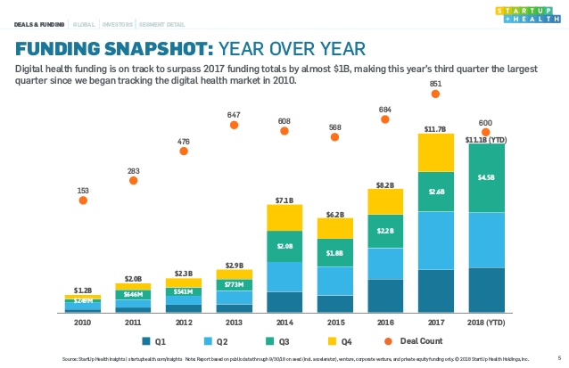 Крупнейшими сделками в 2018 году на сегодняшний момент стали: Peloton ($550 млн), Oscar ($375 млн), Grail ($300 млн), 23andMe ($300 млн), American Well ($290 млн), Butterfly Network ($250 млн) и HeartFlow ($240 млн).