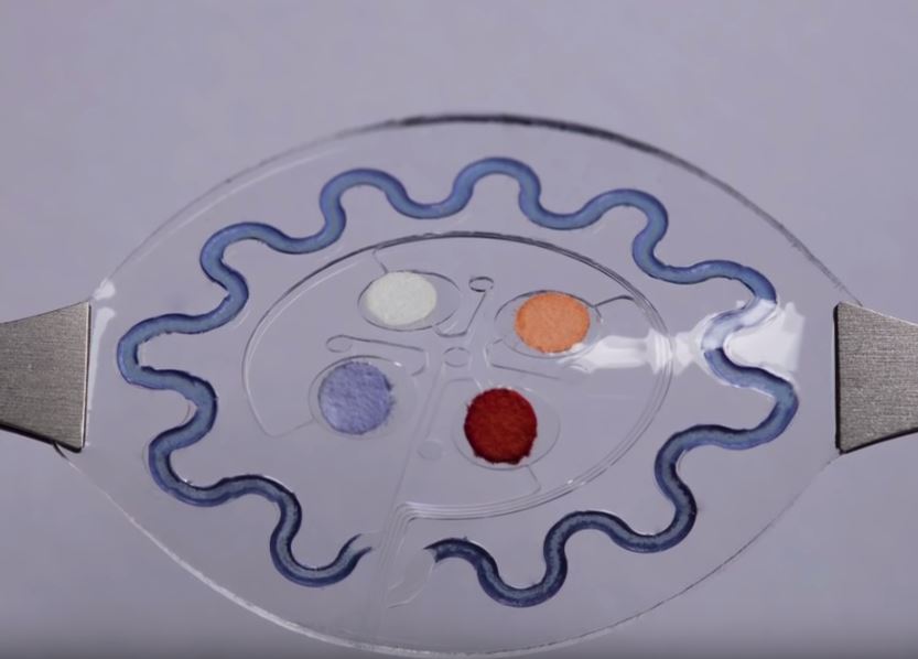Исследователи из Северо-западного университета (США) разработали одноразовый сенсор в виде наклейки на кожу, который анализирует пот. Гибкое, микрофлюидное устройство использует колориметрический биохимический анализ с помощью приложение на смартфоне для мониторинга уровня лактата, сахара, концентрации ионов хлора и pH.