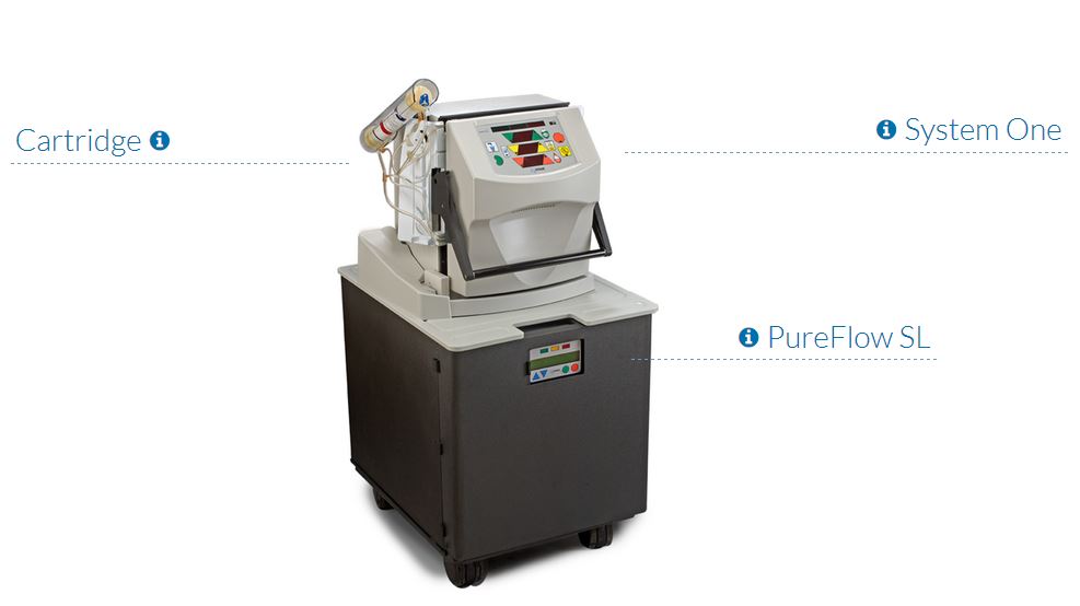 System One - это портативная гемодиализная система, которая предназначена для домашнего использования и предоставляет людям возможность вместо того, чтобы трижды в неделю посещать диализный центр, проходить эту процедуру в удобных условиях своего дома или квартиры. Это единственное в мире устройство, которое имеет официальное разрешение от FDA (U.S. Food and Drug Administration, Управление по санитарному надзору за качеством пищевых продуктов и медикаментов) на проведение ночного гемодиализа, что позволяет проходить лечение как обычно днем или ночью во время сна. При этом в устройстве может использоваться как диализат в стандартных емкостях, так и система PureFlow SL, которая приготовляет диализат из водопроводной питьевой воды. В последнем случае, правда, размеры диализной системы существенно увеличиваются (см. рисунок). System One работает с использованием одноразовых картриджей, которые легко подключаются к устройству и также легко удаляются. Подготовка их к использованию осуществляется автоматически.