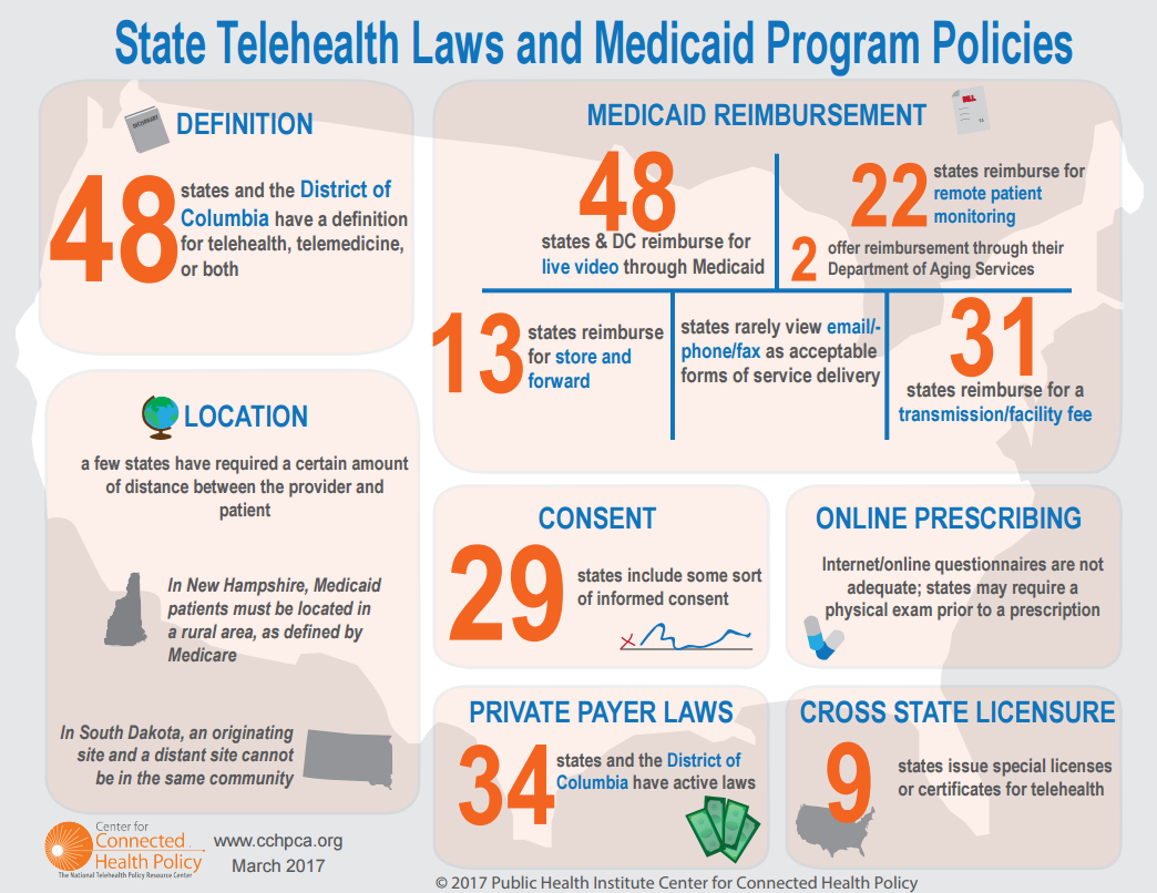 Некоммерческая организация Center for Connected Health Policy выпустила очередной пятый отчет о нормах регулирования и принципах возмещения затрат в телемедицине в США State Telehealth Laws and Reimbursement Policies Report. В этом отчете необходимо отметить один важный факт: в настоящее время уже 48 штатов плюс Вашингтон обеспечивают возмещение затрат пациентов на отдельные виды телемедицины (консультации по видео) через федеральную страховую программу для малообеспеченных граждан США Medicaid*.