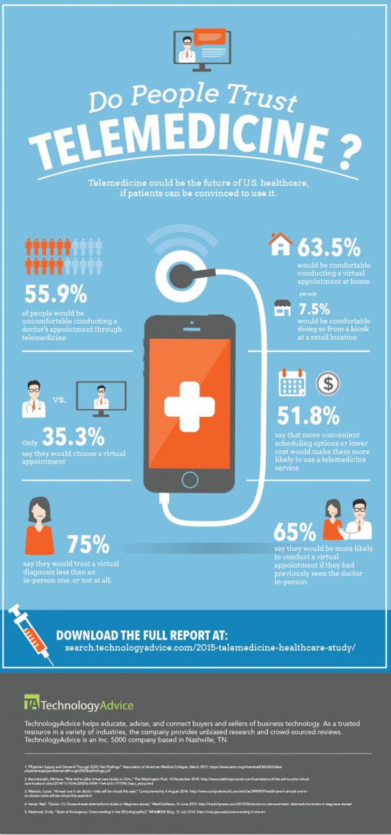 Согласно опросу компании TechnologyAdvice Research, в котором участвовали 504 человека из разных районов США, примерно 75% пациентов не доверяют диагнозу, который поставлен с помощью телемедицины или доверяют ему меньше, чем выводу, к которому пришел врач при личном визите.