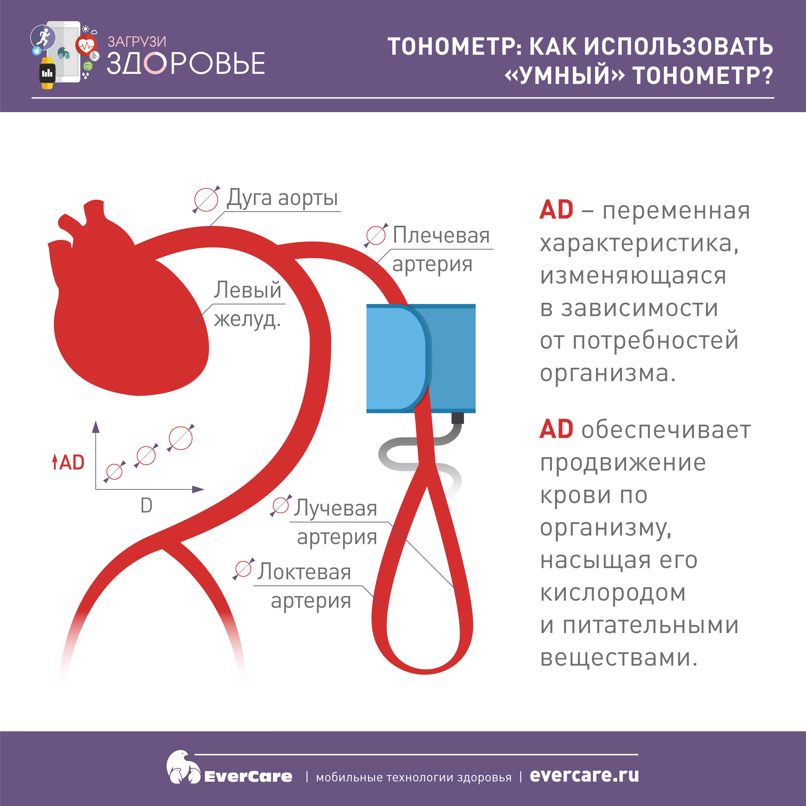 В данном эпизоде хотелось бы рассмотреть такой вопрос: как использовать умный тонометр. В первую очередь, надо понимать, что артериальное давление – это не константа, а величина, которая постоянно изменяется во времени, причем в короткий промежуток времени – довольно значительно. Это некая приспособительная характеристика, которая обеспечивает адаптацию нашего организма к различным факторам. Так, к примеру, за счет того, что артериальное давление повышается, сердце начинает сильнее работать, кровь быстрее бежит по сосудам, и, соответственно, ткани получают большее количество питательных веществ, кислорода и гормонов, различных гуморальных факторов, регулирующих организм. Когда мы спим, в норме артериальное давление чуть ниже. Когда мы физически двигаемся, бежим, активно себя ведем, то артериальное давление начинает повышаться. Это компенсаторная реакция, которая обеспечивает потребность организма в кислороде, в питательных и других веществах, которые обеспечивают регуляцию организма.