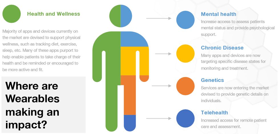 В настоящее время на рынке существует огромное количество устройств, которые могут измерять различные аспекты здоровья человека. Все это возможно благодаря датчикам, встроенным в предметы одежды, различные устройства, ремни часов, наушники и головные повязки. В них интегрированы GPS, высотомеры, датчики для мониторинга активности и здоровья, микрофоны и многое другое. С учетом этого, пожалуй, одной из наиболее значимых возможностей для фармацевтической профессии являются возможность оценки результатов медикаментозного лечения. Данные, полученные с помощью носимых устройств, можно использовать для определения того, когда у пациента может развиться заболевание или обостриться острая болезнь. Например, мониторы сна могут определять, какие проблемы со сном у пациента, а затем предложить, какое лечение он может использовать, а затем выяснить, действительно ли они помогли пациенту. Сенсоры носимых устройств помогают отслеживать то, как пациенты с болезнью Паркинсона реагируют на новые методы лечения. Неврология, кардиология, эндокринология интегрируют такие датчики в свои исследования для сбора цифровых биомаркеров, чтобы понять эффективность препаратов.