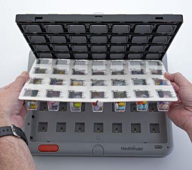 Некоторые из этих диспенсеров используют опциональный аптечный модуль, который может заполняться лекарствами в аптеке, а затем помещаться в устройство.