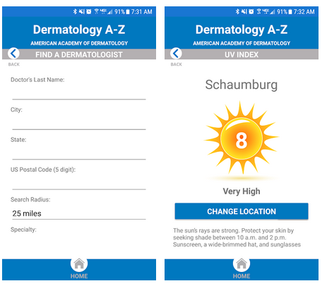 Это приложение от Американской академии дерматологии, которое специально разработанно для потребителей, ищущих информацию о здоровье кожи. Приложение предоставляет научно обоснованную, одобренную дерматологами информацию о здоровье, информацию о заболеваниях кожи, волос и ногтей, а также данные о новейших медицинских и косметических процедур. Используя систему GPS слежения смартфона, приложение может в режиме реального времени показывать индекс ультрафиолетового излучения (правда, не во всех странах), позволяющий оценить опасность ультрафиолетового излучения, а также находить ближайшего дерматолога в этом районе (для жителей США).