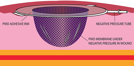 PWD имеет клеящееся основание и рельефную мембрану, которая изолирует рану от внешней среды. Мембрана, благодаря своей уникальной конструкции, выполняет функции пены или марли, которые в настоящее время используются с существующими системами для создания отрицательного давления в ране.