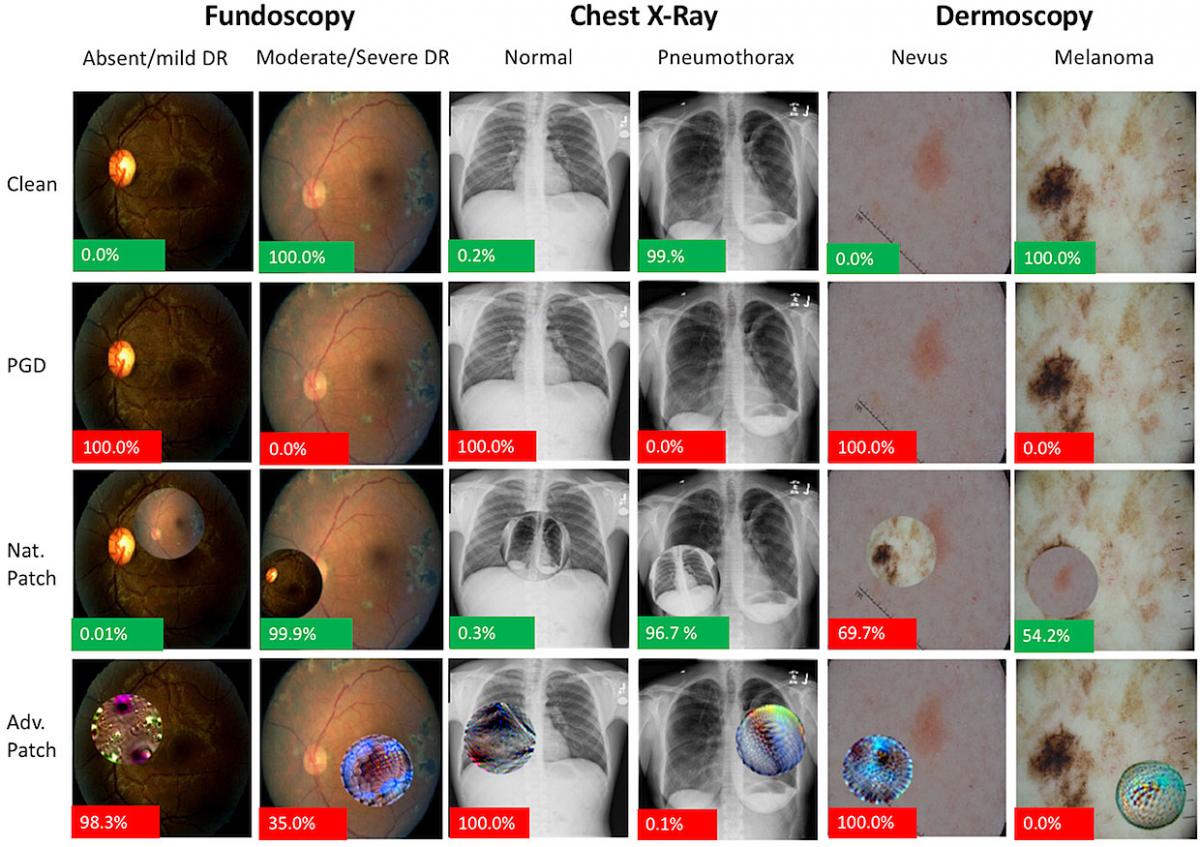 Исследователи решили проверить, насколько трудно ввести в заблуждение систему анализа медицинских изображений. Разработчики обычно регулярно тестируют алгоритмы глубокого обучения с помощью т.н. "враждебных образцов", специально сделанных для того, чтобы определить ограничения текущих методов глубокого обучения. В этом исследовании использовали такие методы при выполнении трех популярных задач - обнаружении диабетической ретинопатии по изображениям сетчатки, пневмоторакса по рентгеновскому снимку груди и меланомы по фотографии кожи. При этом некоторые пиксели в этих изображениях были модифицированы таким образом, что человек их воспринимал как минимальные искажения, а компьютерный алгоритм некорректно их классифицировал.
